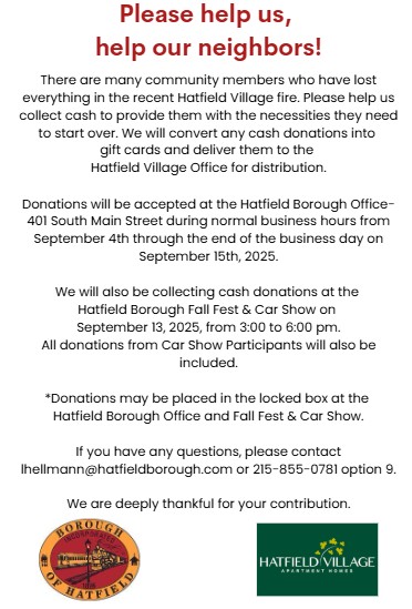 Every year, the Hatfield Borough Fall Fest & Car Show donates all proceeds donated by the Car Show participants to a local non-profit. This year, HB has chosen to contribute those funds to residents impacted by the Hatfield Village Fire. #hatfieldstrong #community