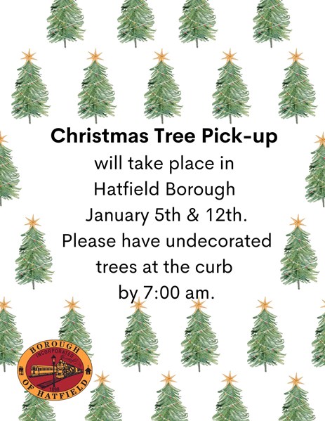 Home Resources News Christmas Tree Pick-up Jan 2, 2026 General News General News Events Holidays All Articles Recent Articles Christmas Tree Pick-up Snow Emergency Declared Office Closed Resources Calendar Forms & Permits Feedback News Site Map Request for Services Hatfield Borough Municipal Complex 401 South Main Street P.O. Box 190 Hatfield, PA 19440 Emergency Utility Number: 267-421-4753 Phone: (215) 855-0781 Fax: (215) 855-2075 admin@hatfieldborough.com Hours Monday, Tuesday, Thursday: 8:30 am - 4:00 pm Wednesday: 8:30 am - 6:00 pm Friday: 8:30 am - 3:00 pm View Contacts & Directory